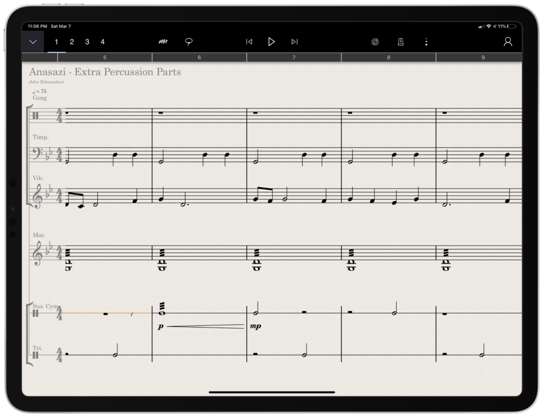 Most of my testing for StaffPad included preparing for my recent band concerts. My Concert Band has 10 percussionists and some of my music had only three or four parts. I also have some flutes in my Jazz Band this year, and planned some repertoire that does not have original flute parts. Arranging these additional parts took place while I was on leave for the birth of my first child and was awaiting a return to school, where I would have only two weeks to prepare this concert before the performance date.